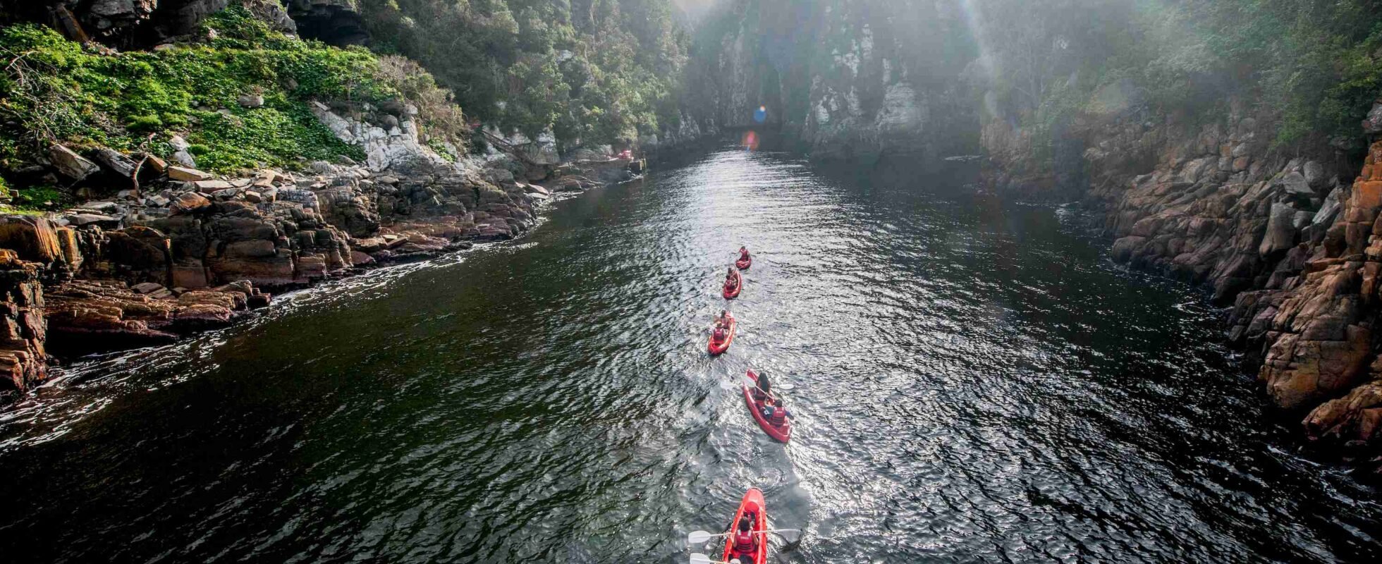 Padle, flyde og springe… det er kort sagt, hvad Kayak and Lilo Adventure ved Storms River Mouth i Tsitsikamma National Park går ud på. Den 2-3 timer lange tur begynder enten med kajaksejlads over havet under hængebroen eller vandretur gennem skoven for at starte højere oppe, afhængigt af vandforholdene. Du padler gennem kløften, forbi huler, klipper og lange strækninger med stille vand, inden du skifter til en lilo for at flyde dybere ind i de smalle dele af floden. På tilbagevejen kan du vælge at springe ud fra klipperne ned i de dybe bassiner, eller du kan bare nyde den rolige tur tilbage.