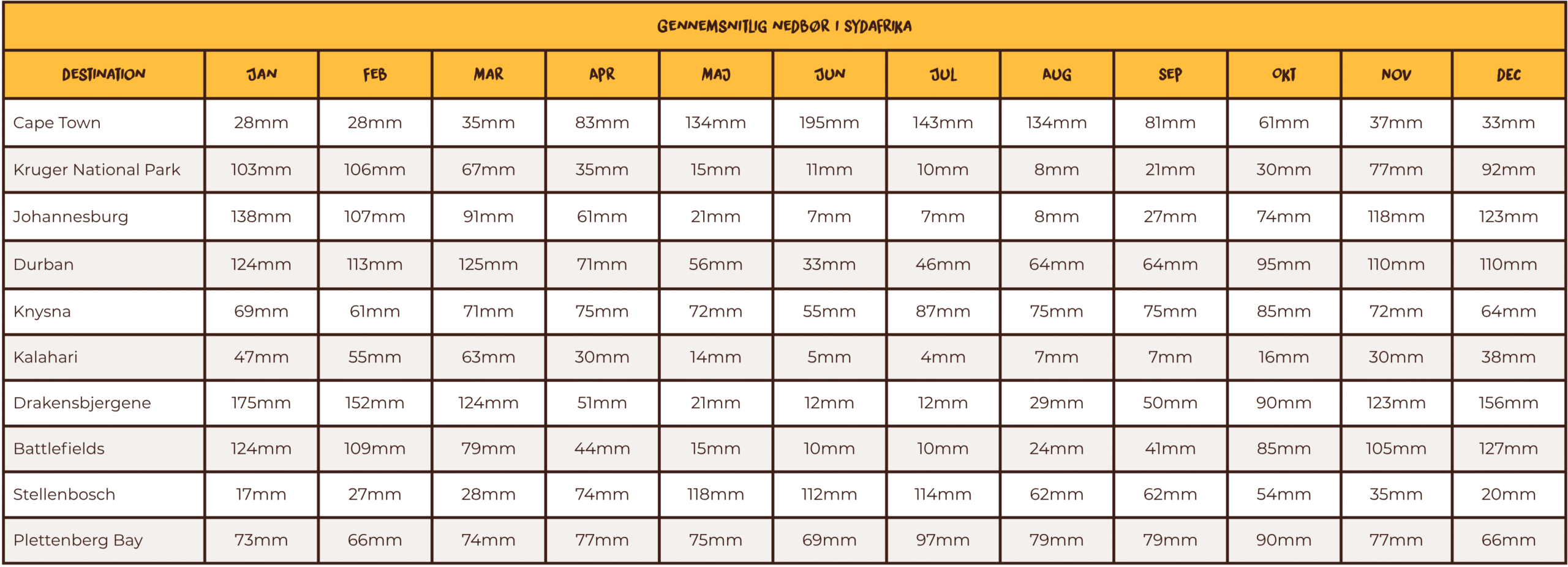 Planlægger du en rejse til Sydafrika? Så får du brug for mere end solcreme og safaristøvler! Vejret i Sydafrika kan nemlig byde på lidt af hvert. Alt fra varme, solrige dage til kølige morgener, regn og endda sne (ja, det sker faktisk!). Det mest overraskende er, hvor forskelligt klimaet er fra område til område – fra tropisk til ørkenlignende og middelhavsklima. Så hvis du er ved at pakke til dit eventyr, får du her et overblik over vejret i de forskellige regioner. Uanset om du skal på safari i Kruger eller udforske Cape Town, spiller vejret en vigtig rolle for din rejseoplevelse. Lad os se nærmere på det.