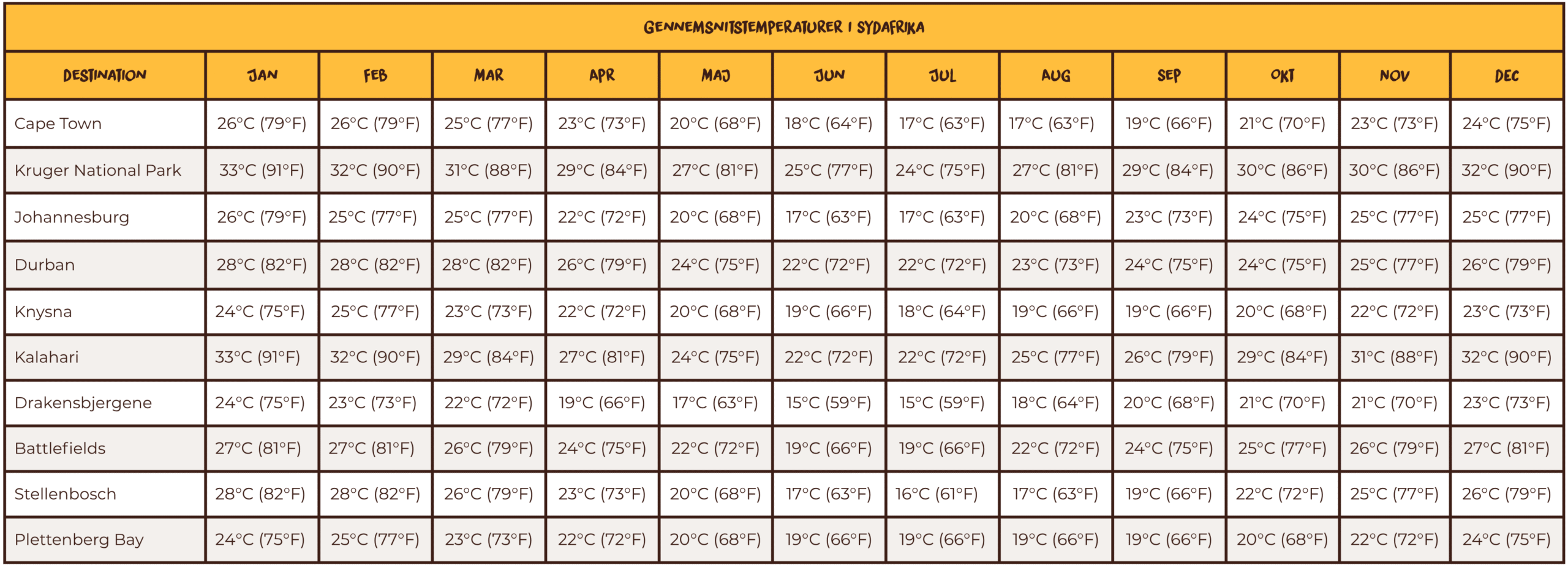 Cape Town har et kystklima med tydelig forskel på sommer og vinter. Om sommeren ligger temperaturerne typisk omkring 25°C, mens de om vinteren kan falde til omkring 7°C. Den berygtede sydøstenvind sørger for at holde temperaturen nede i de varme måneder, og om vinteren kan der af og til falde sne på de højere bjergtoppe. Hvis du skal vandre på Table Mountain, skal du være forberedt på det såkaldte “Table Cloth” – et lag af skyer, der dækker toppen og bringer fugt til det ellers tørre område. Denne fugt er vigtig for de mange plantearter på bjergtoppen, især i de lange, tørre sommermåneder.
