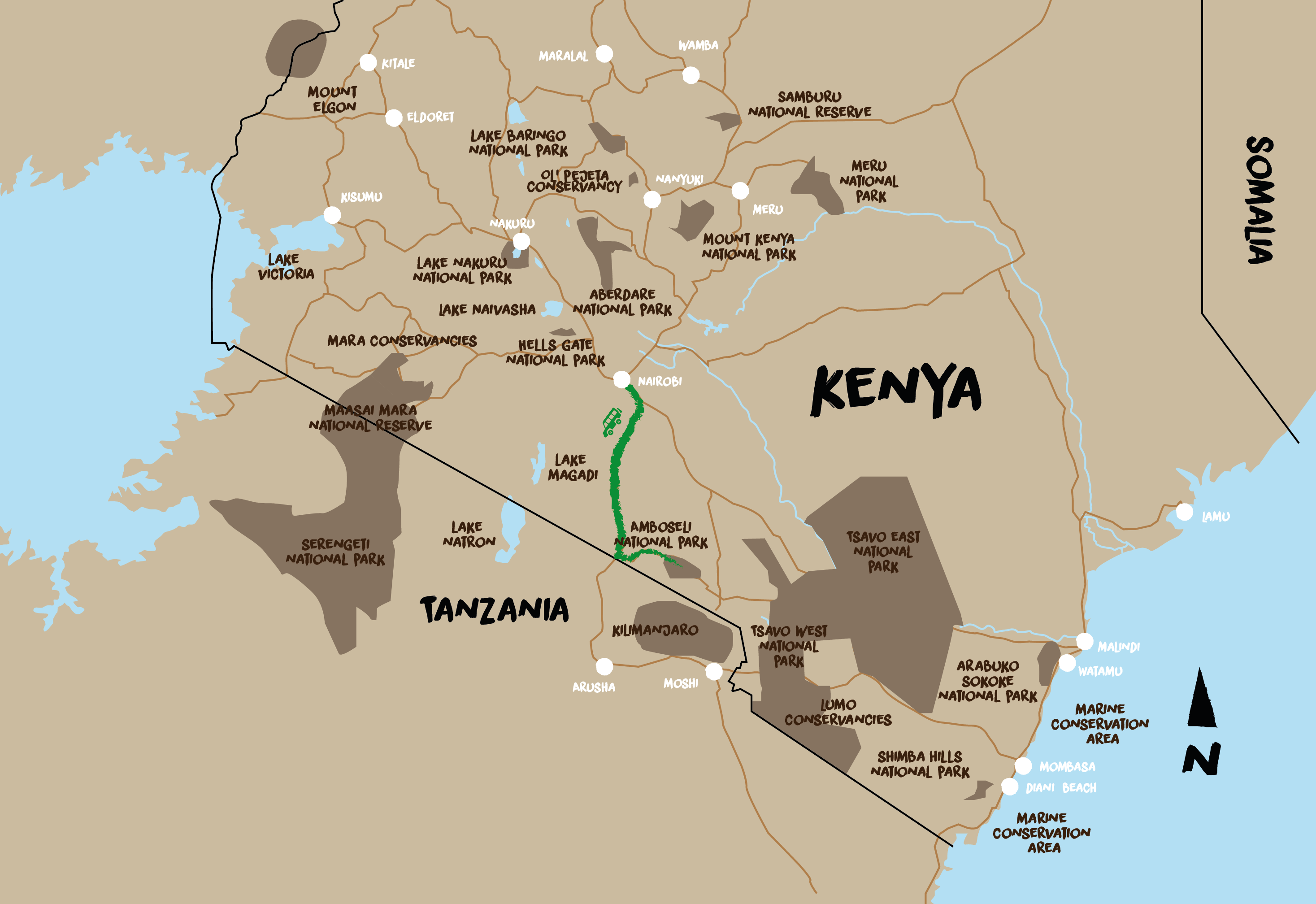Parken ligger tæt på Nairobi og er kendt for sit rige dyreliv, vilde landskaber og fantastiske safariture. Men det er især elefanterne, der gør Amboseli til noget særligt. Her vandrer store flokke frit omkring ved foden af det ikoniske Kilimanjaro, og med lidt held kan du spotte de sjældne og imponerende supertuskere.