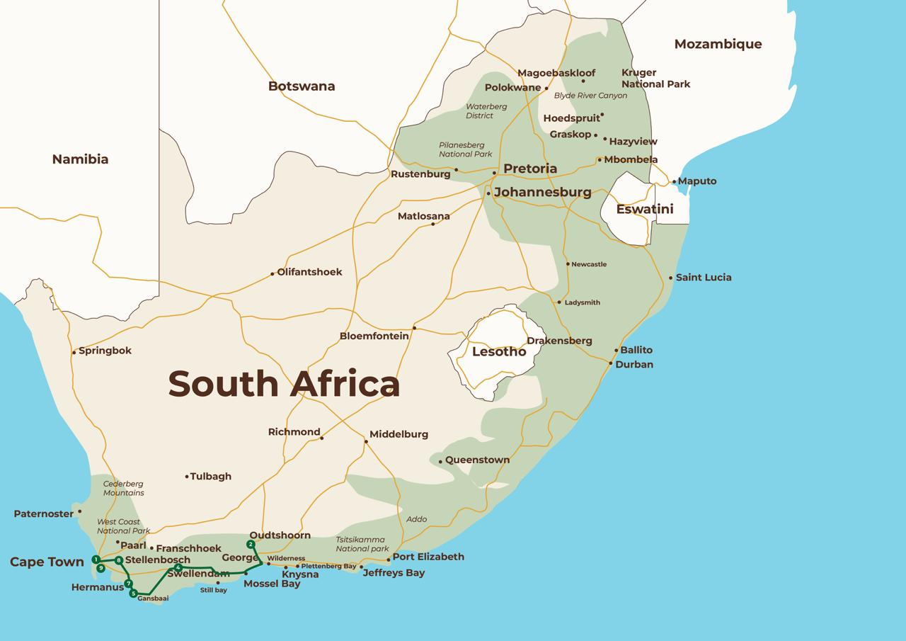 En ideel start på din rejse i Sydafrika er at forkæle smagsløgene med en vinsmagning i Robertson, inden turen går videre til Oudtshoorn midt i Klein Karoo. Her finder du både strudsefarme, gamle huler og kan tage på spændende safariture.